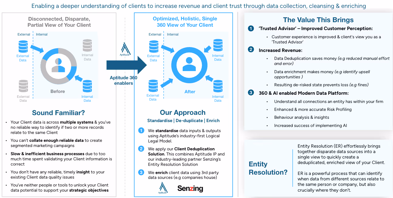 Aptitude are experts in deploying Senzing in any client on-premise or cloud environment including GCP, Azure and AWS. Entity Resolution as a data management tool brings benefits way beyond Fraud and Financial Crime. Using our deep domain experience in data integration and data management in some of the largest Financial Services companies in the world, Aptitude have developed a best practice deployment architecture for implementing Senzing in a client's own data environment. Adding Entity Resolution to your data management arsenal brings a significant number of benefits including increased data trust and accuracy, improvements in revenue, operational efficiency gains and enabling Artificial Intelligence journeys. Shown below is an example of how Entity Resolution can benefit the Legal Sector.