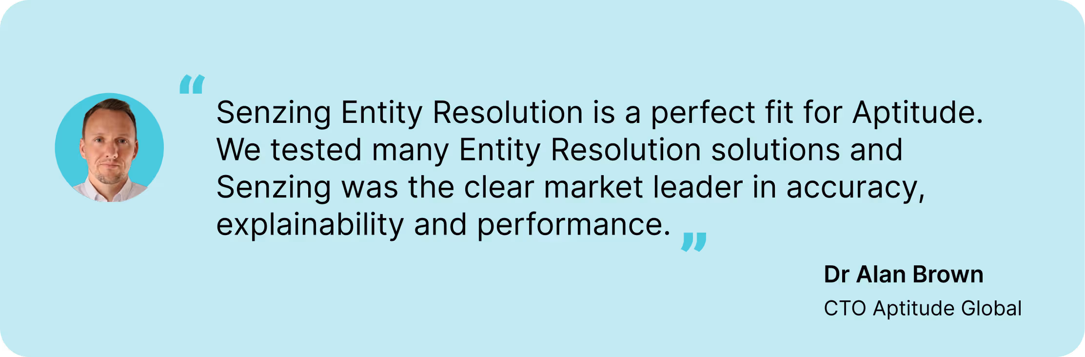 At Aptitude we understand the importance of good quality data. Our Customers are building increasingly complex data driven solutions with high levels of automation with an increased use (and reliance) on Artificial Intelligence. However, many of these initiatives fail due to poor quality data. Their data exists in many data silos, is structured inconsistently, is often duplicated and it can be difficult to find meaningful relationships in their data without significant manual effort. When this data is used for AI or embedded in operational solutions, it often results in inconsistent and unreliable results. At Aptitude we sought to solve this problem by providing an Entity Resolution solution that we can integrate into a Client's own data environment - embedded in their data pipelines, powering their data platforms and improving their overall data quality. We extensively tested tools in the marketplace alongside our own custom solution and decided to partner with Senzing and their Entity Resolution API as it is the clear market leader.